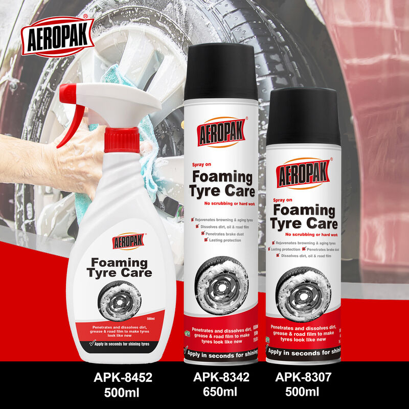 Aeropak Foaming Tyre Care contains a macromolecule ingredient that penetrates to remove road grime, brake dust, dirt, film, and grease. This specialized formula provides long-lasting protection and rejuvenates browning and aging tires, leaving a spot-free finish.